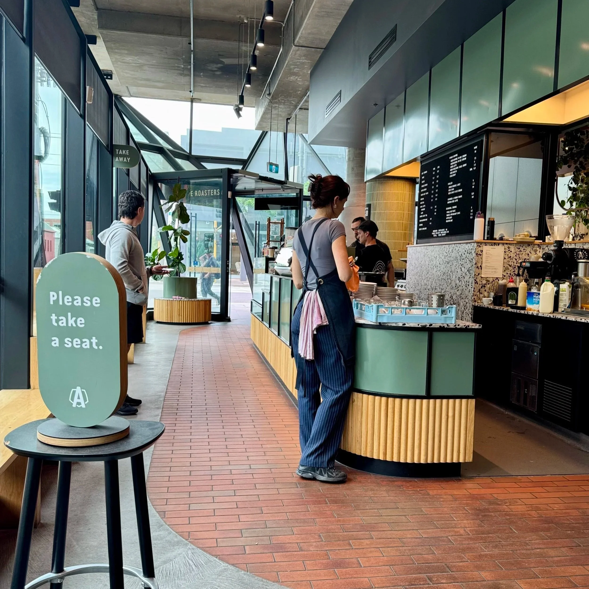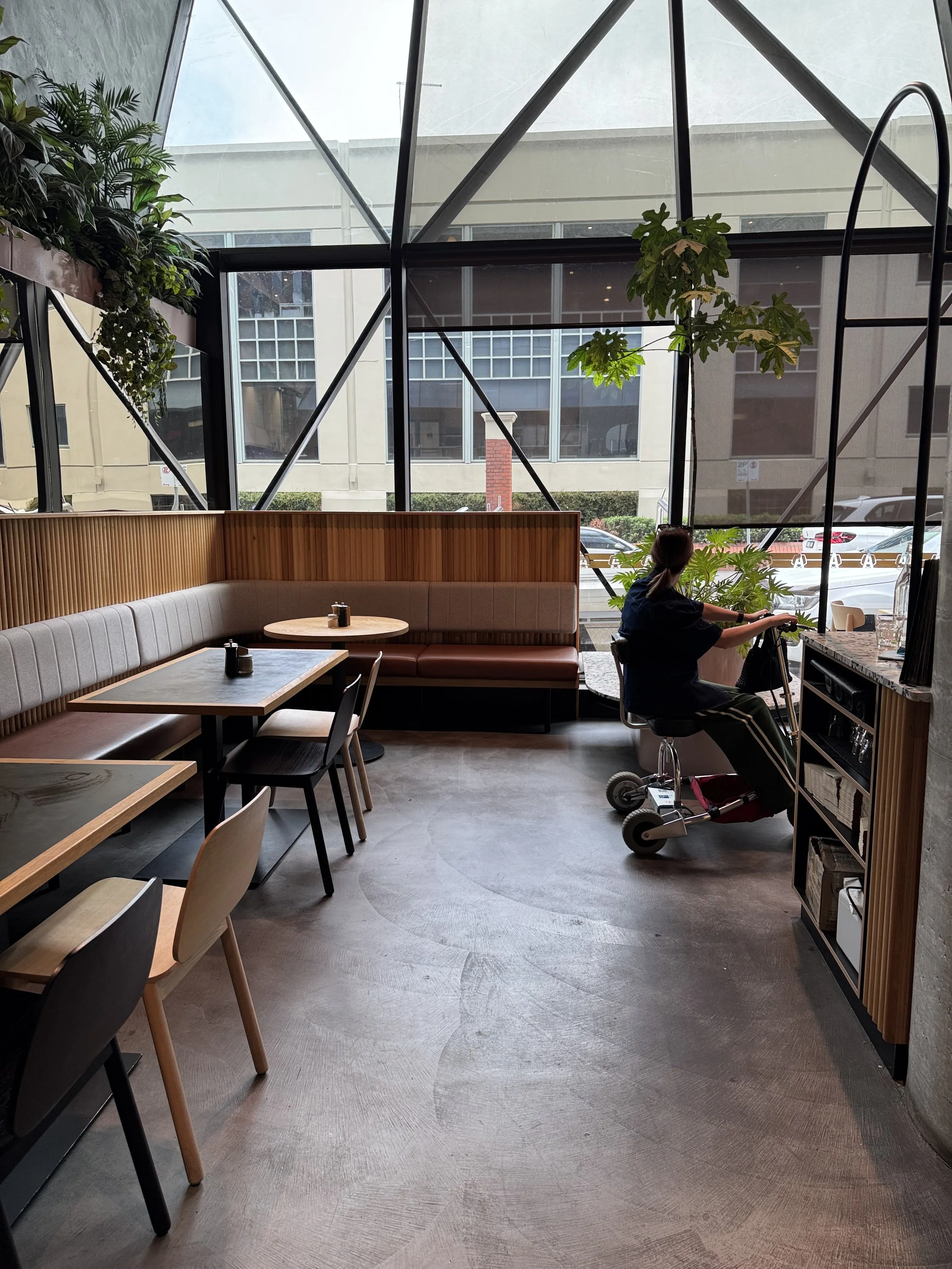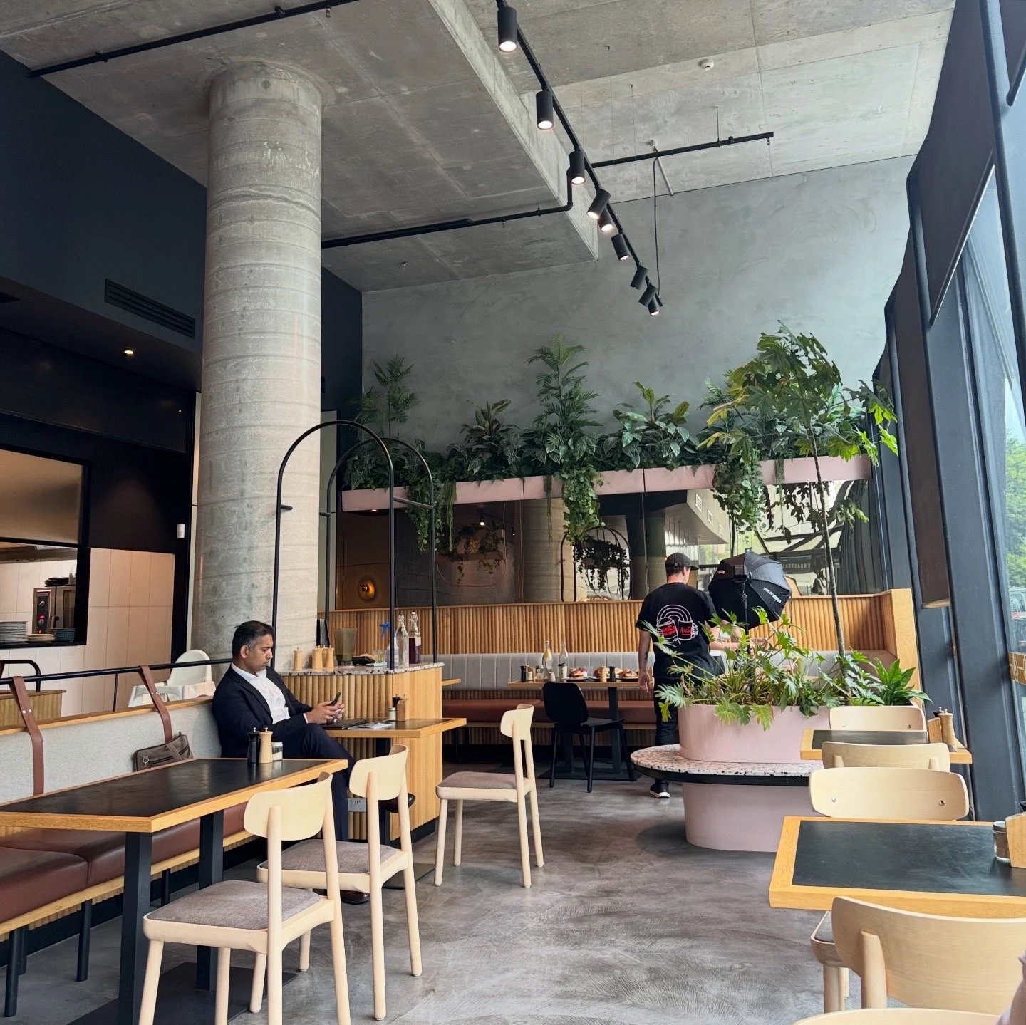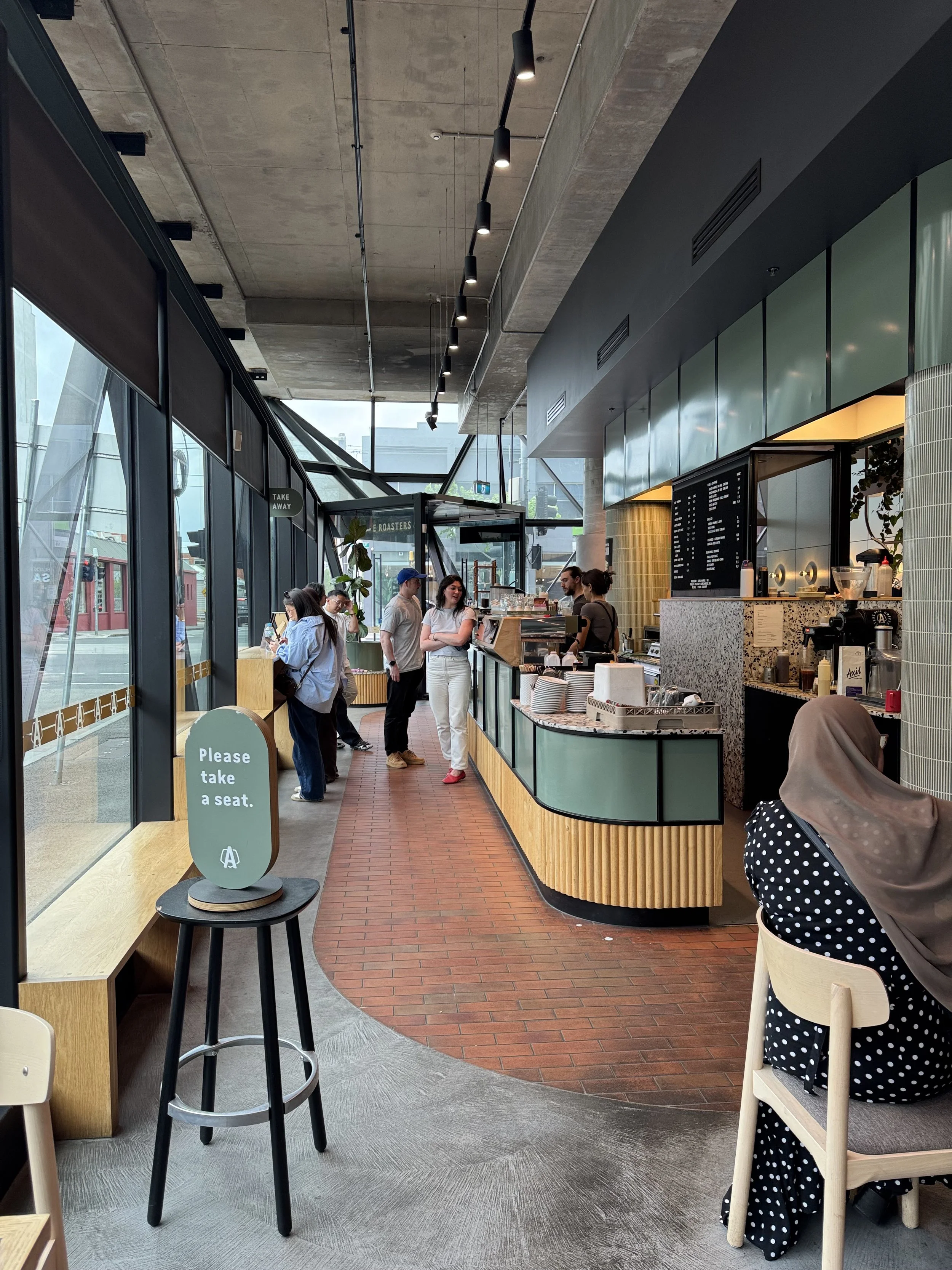 Inside, the interior is warm with leafy green tones, giving it a calm, welcoming feel. There’s a mix of cafe style seating and booth seating (all standard height). It doesn’t feel cramped or chaotic, and there’s enough room to move comfortably.