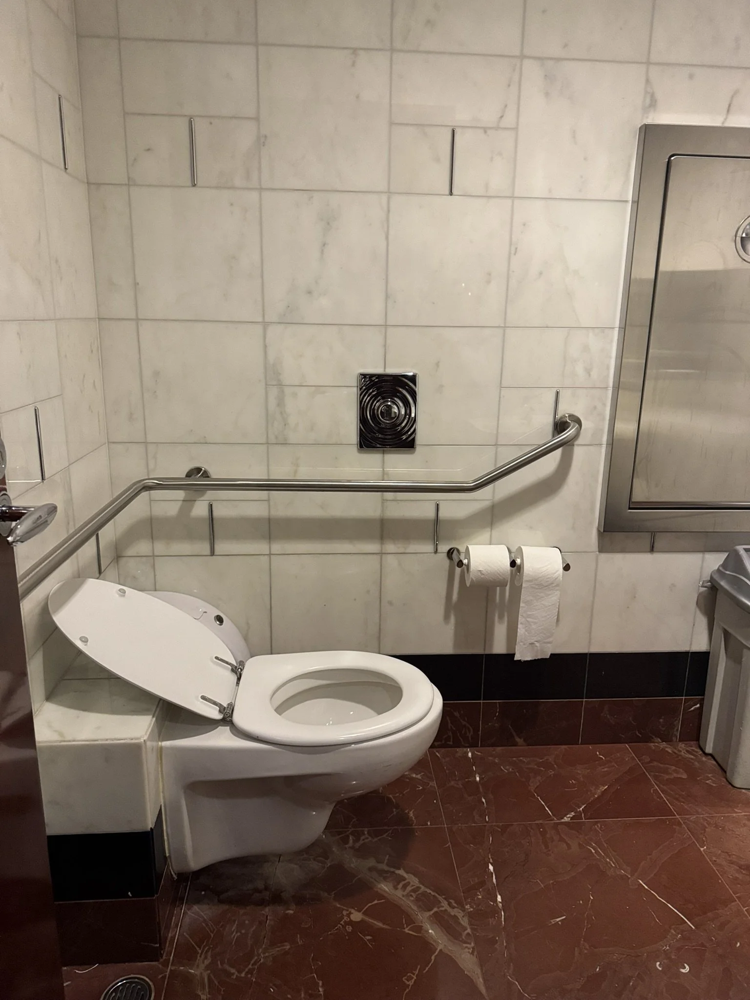 I didn’t manage to see an accessible toilet on level 19, but the accessible toilet back on ground level (opposite the lounge) gets a pass. It’s not the biggest and doesn’t have a backrest, but the grab rails are there and it’s workable.