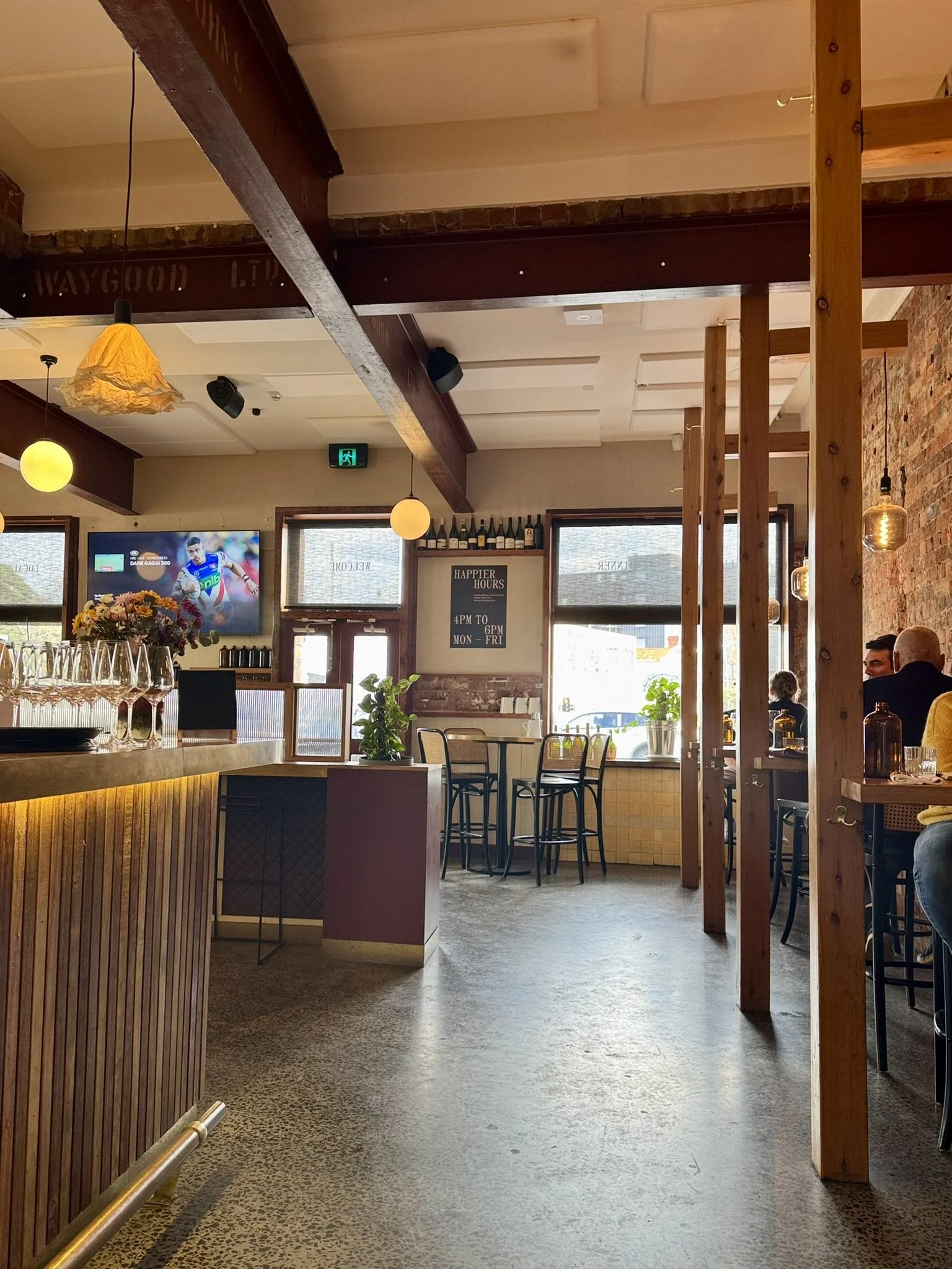 The front bar leans traditional, with high tables and bar stools, but a sweet touch is the clever little bag hooks under the tables - love that attention to detail. There are a few standard height tables on the right hand side too, making it a versatile space for different needs. Head towards the back and you’ll find the main dining area, with standard tables along the left wall and cosy booths on the right. It’s warm, inviting, and spaced well enough to navigate with a mobility aid. It has that classic pub feel without feeling cramped.
