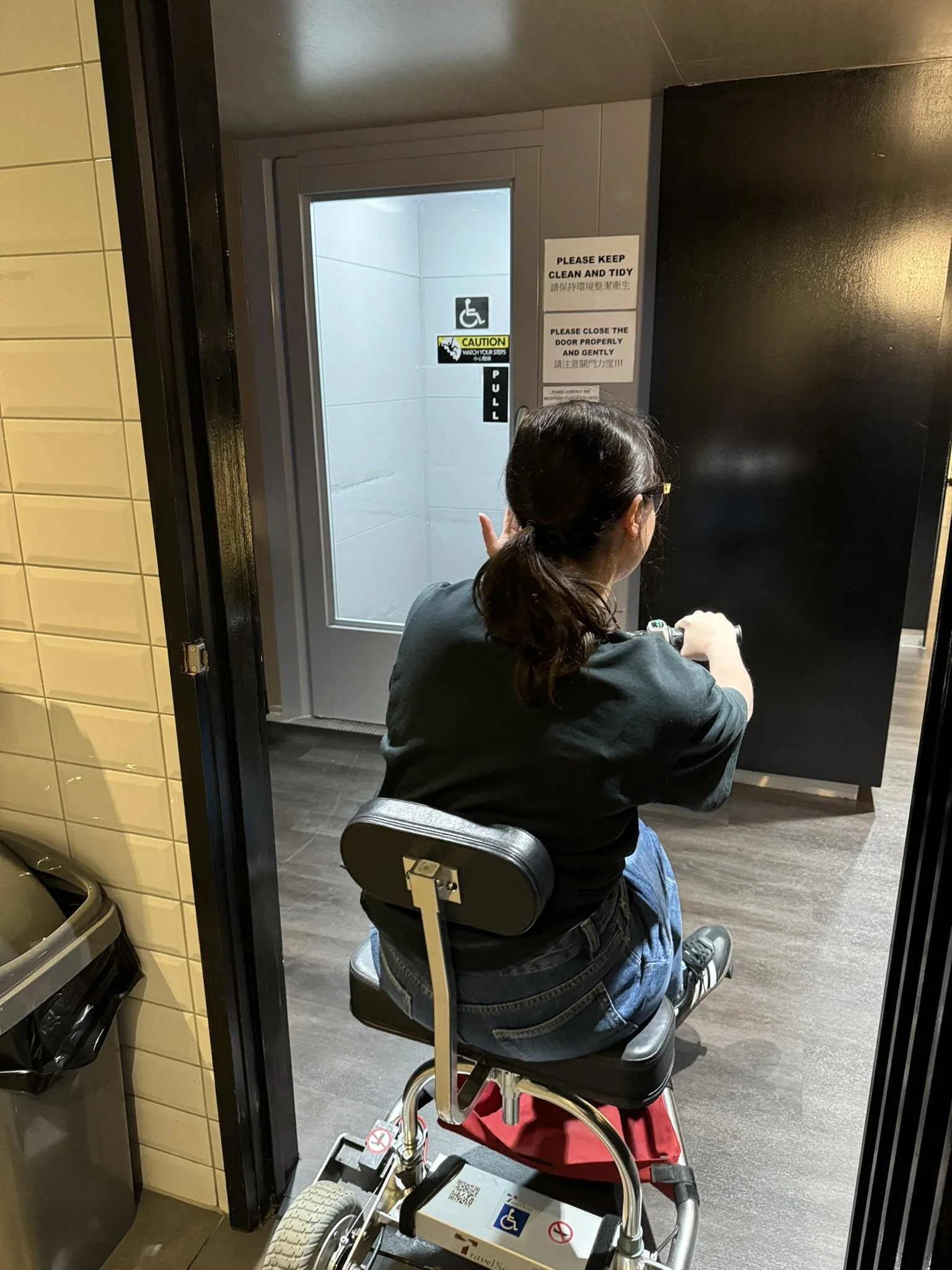 Now, let’s talk about the accessible toilet. It’s upstairs, and the only way to reach it is via a lift - through the kitchen. Not ideal! The path is narrow, with trolleys in the way, making it a bit of a squeeze. If you have a wider chair or power chair I don’t think it would be possible. Once you’re on level 1, though, the toilet itself is great. It’s just a shame that getting there is not very accessible.