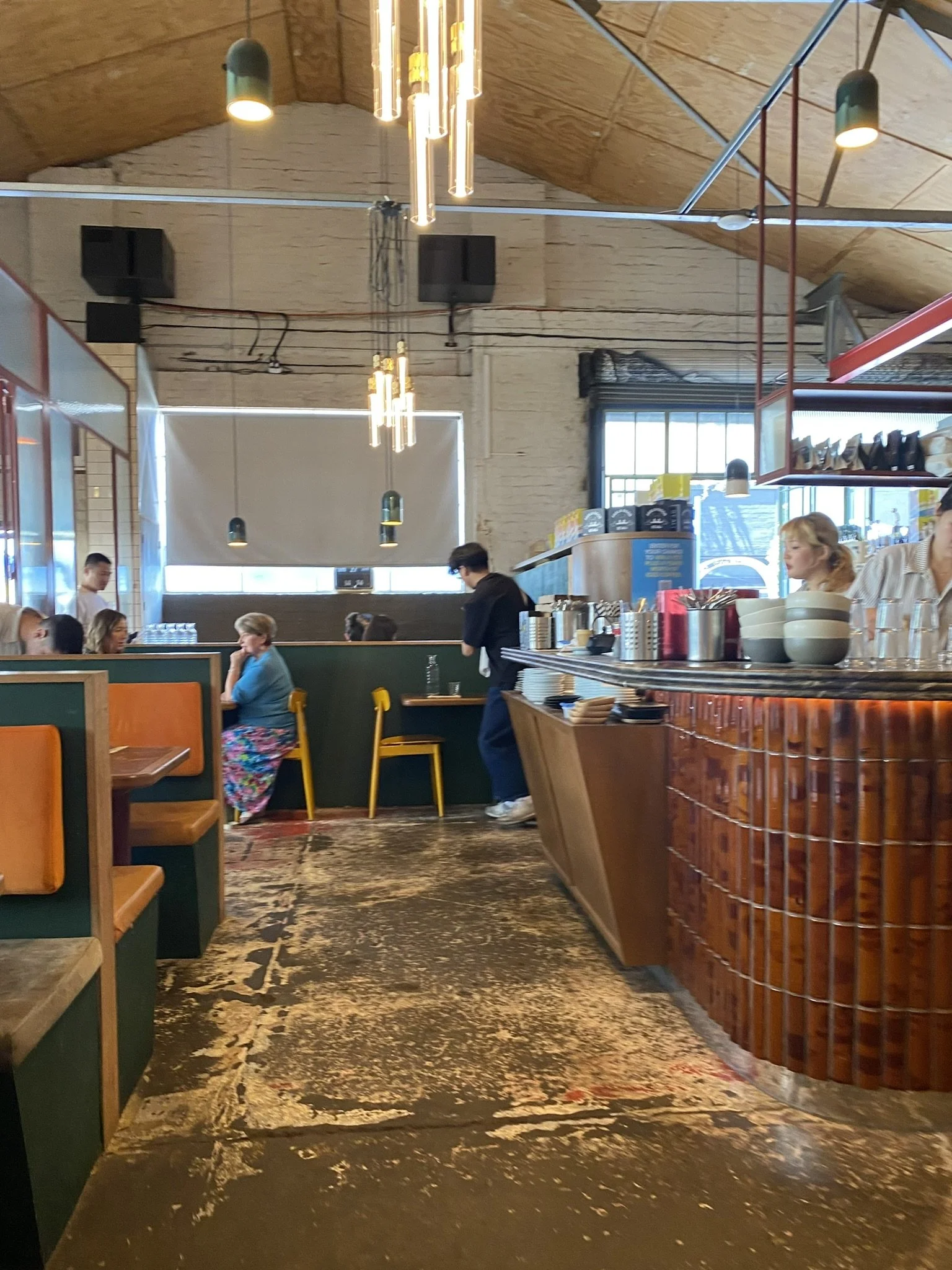 Take your pick of either indoor or outdoor dining; both areas are accessible! The outdoor terrace area has all standard height tables + chairs. Inside has a warehouse feel, complete with a little general store. Inside you’ll find a mixture of seating options - plenty of standard tables + chairs, booths and a few bar stools. It’s big and open and you definitely don’t feel close to the table next to you. Inside is wide enough for aids and outside, although a touch narrower on the footpath, I could leave my scooter next to me with ample room.